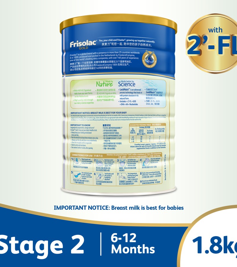 Introducing Frisolac Gold Stage 2, an infant milk powder formula for 6-12 months old’s. Frisolac Gold Stage 2 contains important nutrients to support overall growth and development. Frisolac uses LockNutriTM which is an advanced process technology that locks in milk protein structure in its natural form. Our infant formula is 100% produced and packed in the Netherlands. Frisolac is a global brand with presence in more than 20 countries worldwide.