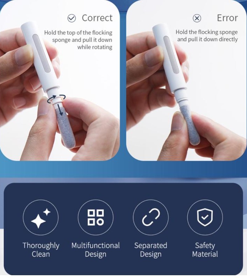 Same as the pen tip, the cleaner pen protects the cleaning surface with a round-headed tip, getting deep into the hard-to-reach dead corners and scraping up the stubborn dirt effortlessly. Make sure an all-round cleaning and leave no dirt to survive.