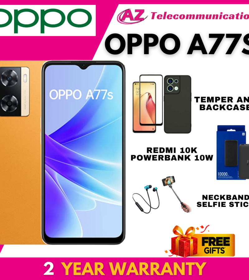 • FREE GIFT 2 : TEMPERGLASS, BACKCASE, REDMI 10K POWERBANK, SANDISK DUAL DRIVE TYPE C 32GB ​ **​OPPO A77S 8/128GB (2YEARS OPPO OFFICAIL WARRANTY)**