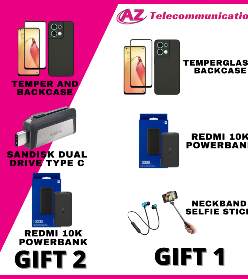 • FREE GIFT 1 : TEMPERGLASS, BACKCASE, WIRELESS NECKBAND, REDMI 10K POWERBANK, SELFIE STICK