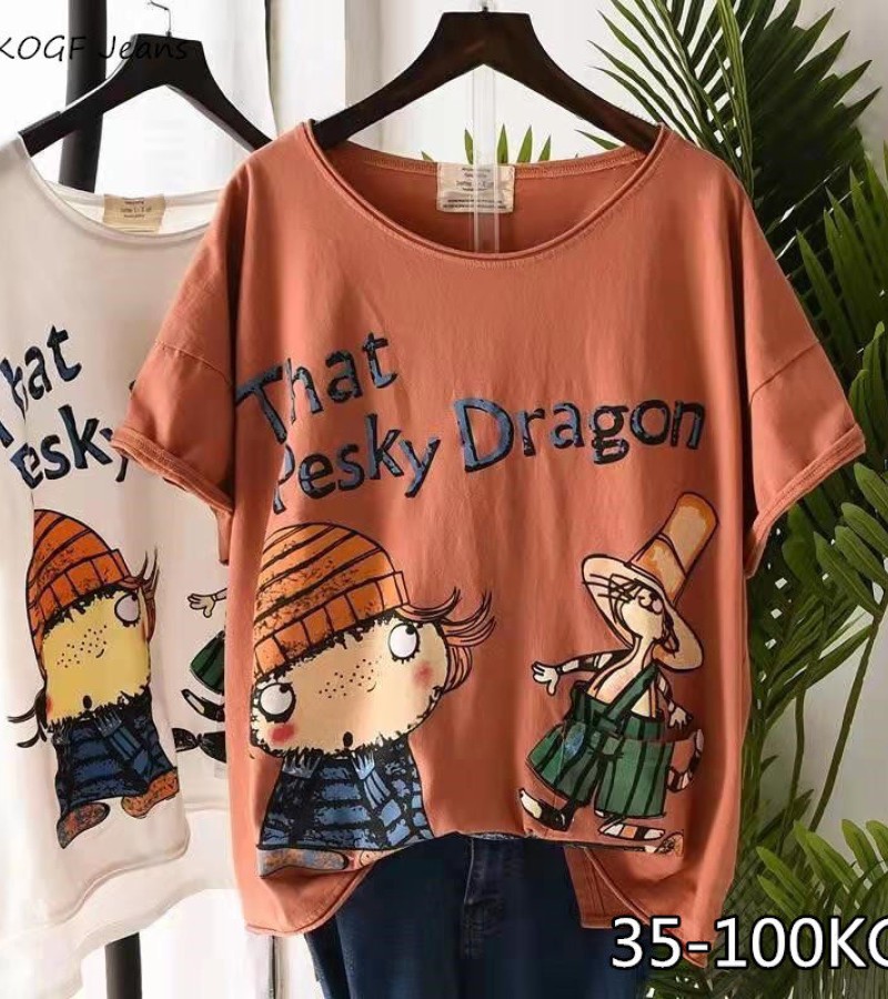 PKOGF夏季新款加大码女式T恤休闲宽松卡通印花图案加大码短袖上衣
