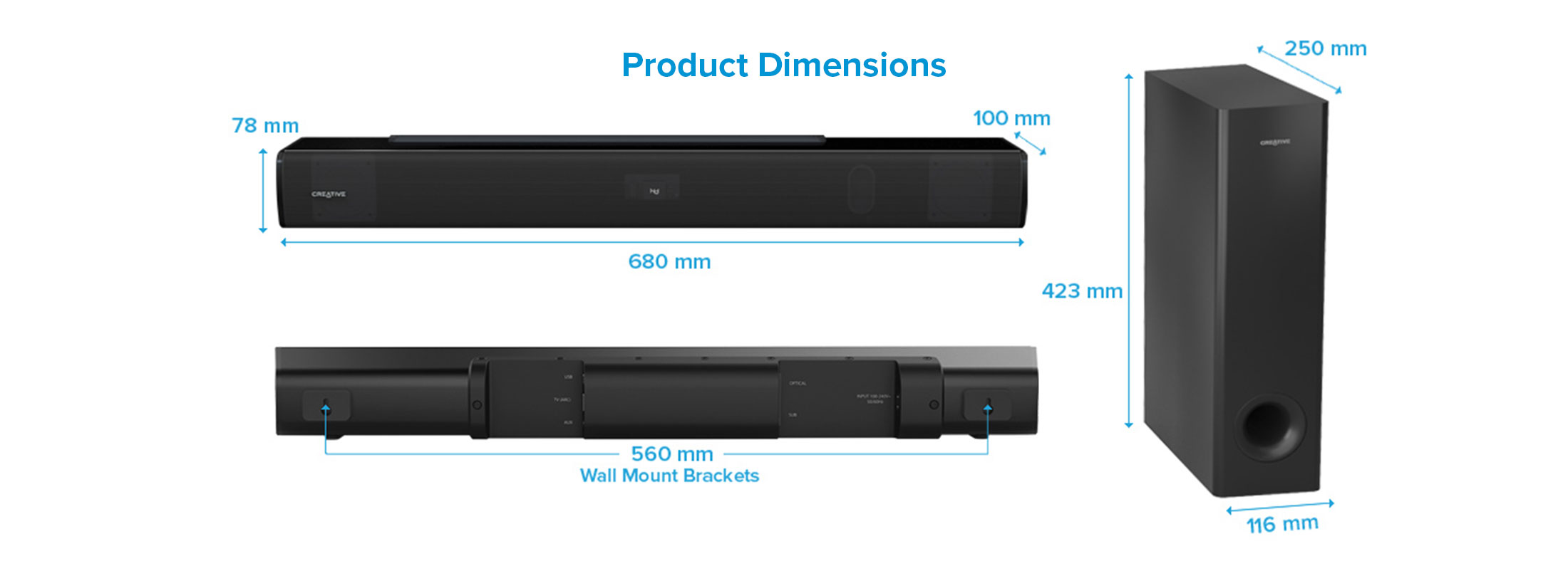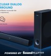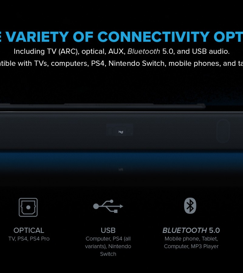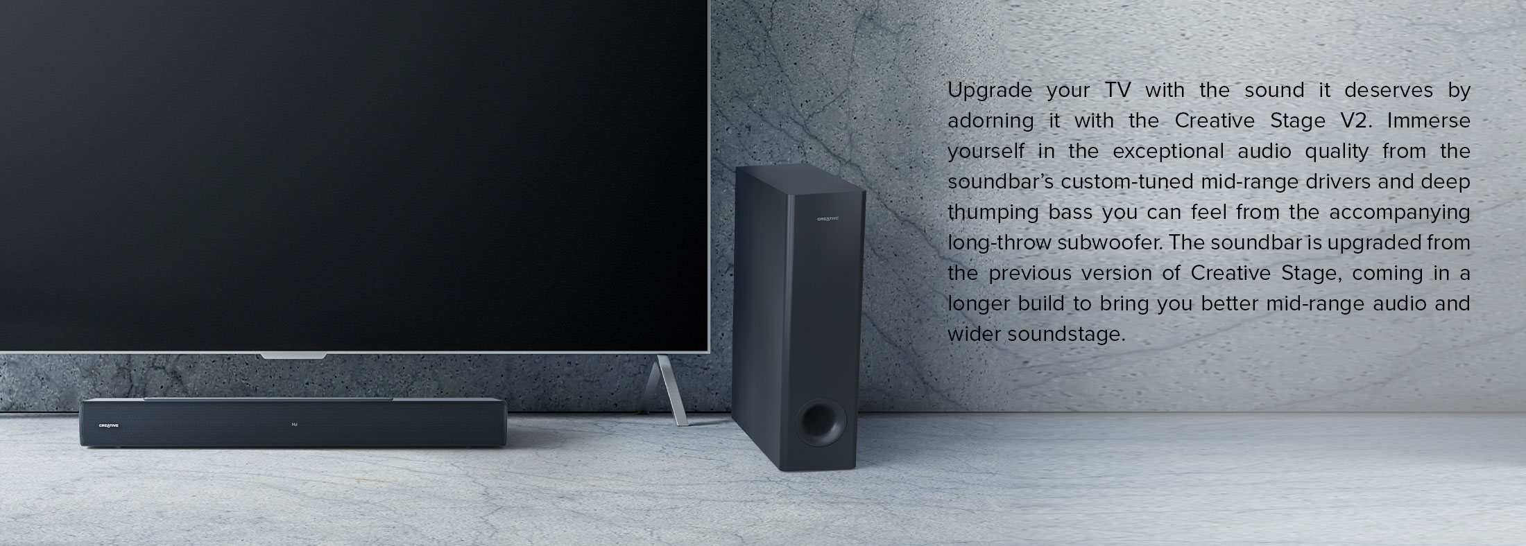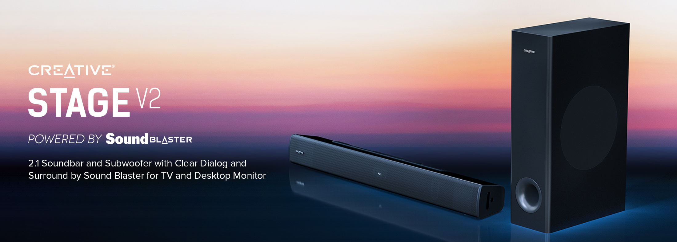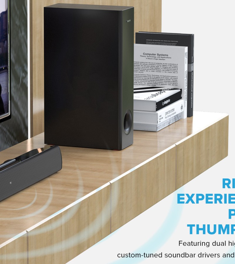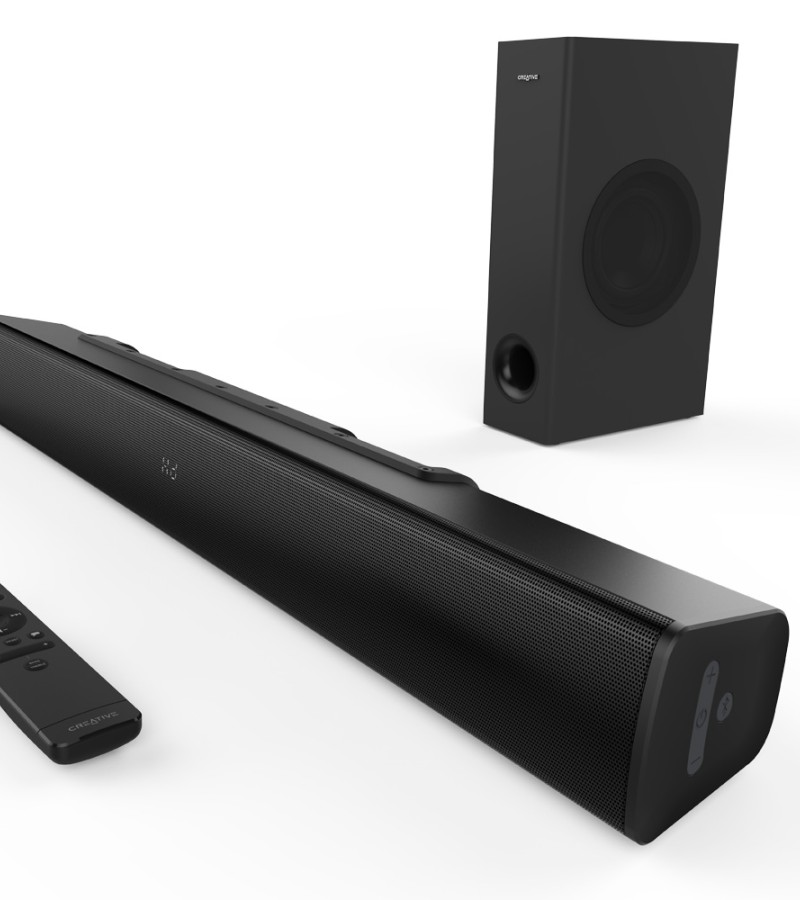 Creative Stage V2-2.1条形音箱,带低音炮、清晰对话和Sound Blaster环绕声、蓝牙5.0、电视ARC、光学和USB音频、壁挂式、可调节低音和高音,适用于电视