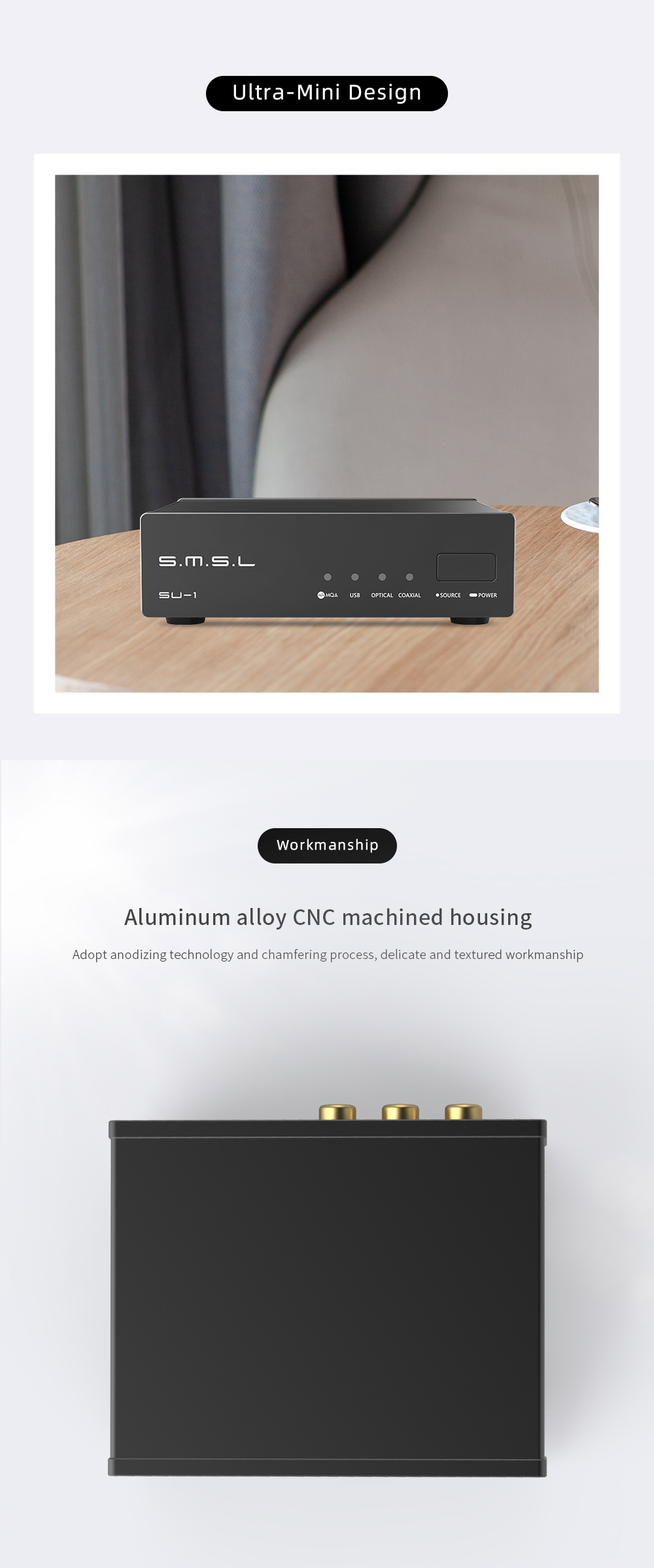 > The SU-1 features a CNC aluminum alloy housing, ensuring durability and excellent heat dissipation. This compact design is perfect for those seeking a high-quality DAC without taking up too much space.