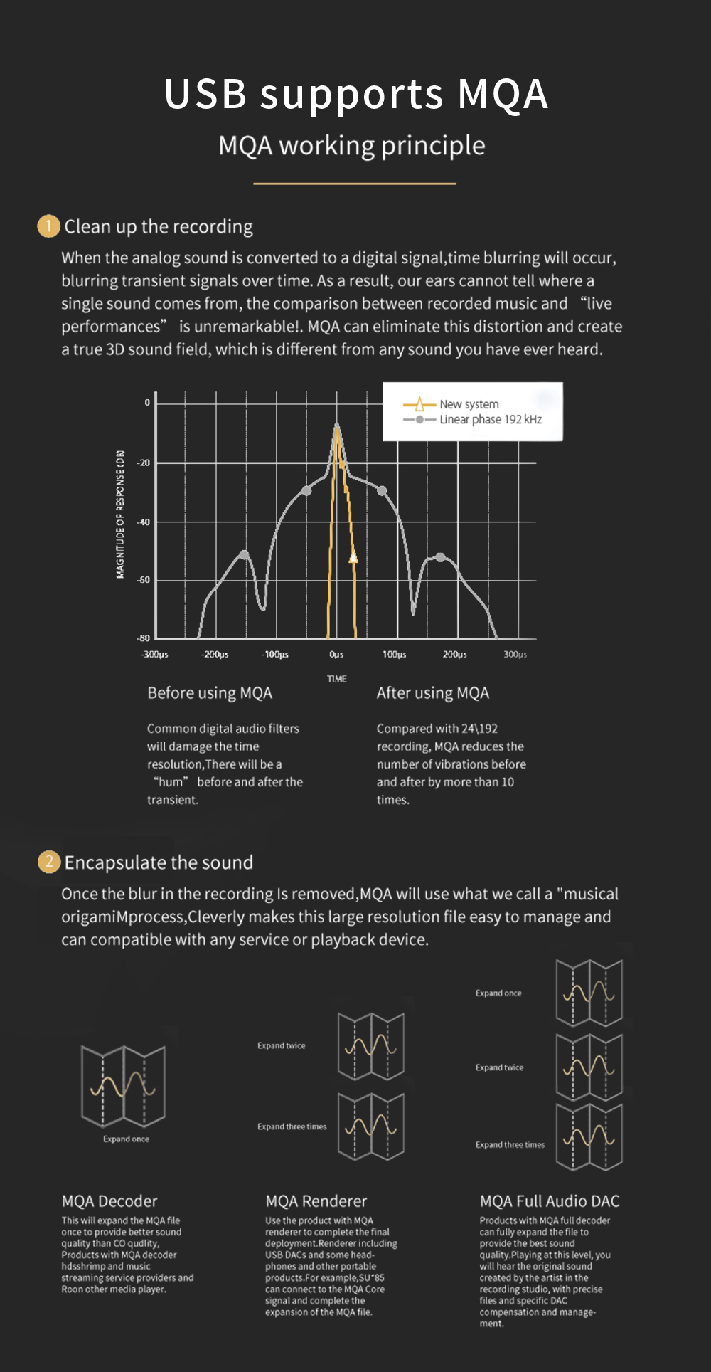 > The SMSL SU-1 supports Hi-Res Audio, featuring the latest MQA technology, and MQA CD playback. With its advanced decoding capabilities, it ensures the highest quality audio reproduction, perfect for audiophiles seeking true-to-life sound.