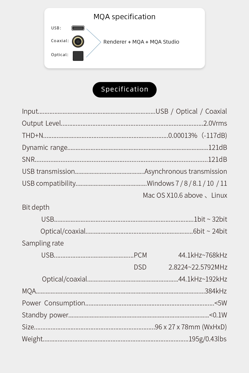 > Max bit depth and sampling rate: 32bit/768kHz PCM USBM, 22MHz DSD USB, > 24bit/192kHz Optical/Coaxial